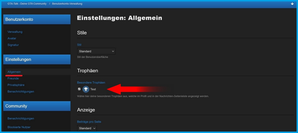Damit die Trophäen bei euch in der Nachrichten-Seitenleiste und im Profil angezeigt werden, müsst ihr diese erst in euren Einstellungen aktivieren: