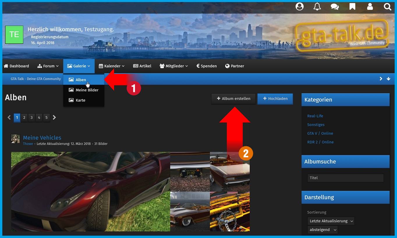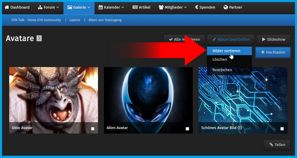 In der Galerie habt ihr die Möglichkeit eigene Alben anzulegen. Ihr könnt eure Bilder in der Galerie beliebig zwischen verschiedenen Alben hin und her verschieben. Um ein neues Album zu erstellen klickt unter dem Reiter "