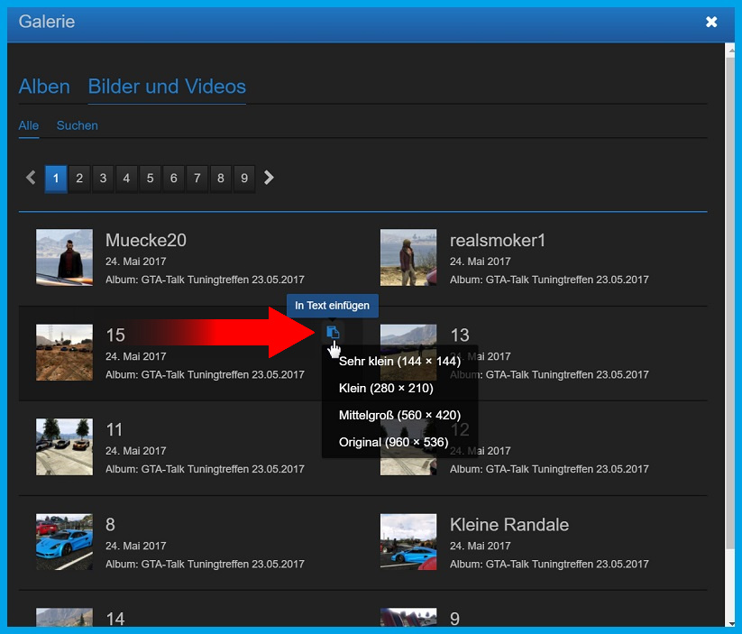 Da das doppelte hochladen von Bildern vermieden werden soll, steht euch eine Funktion zur Verfügung mit der ihr eure Bilder aus der Galerie in einen Beitrag einfügen könnt. Klickt dazu auf das Galerie-Symbol im Editor und wählt euer Bild oder aber auch ein ganzes Album aus.