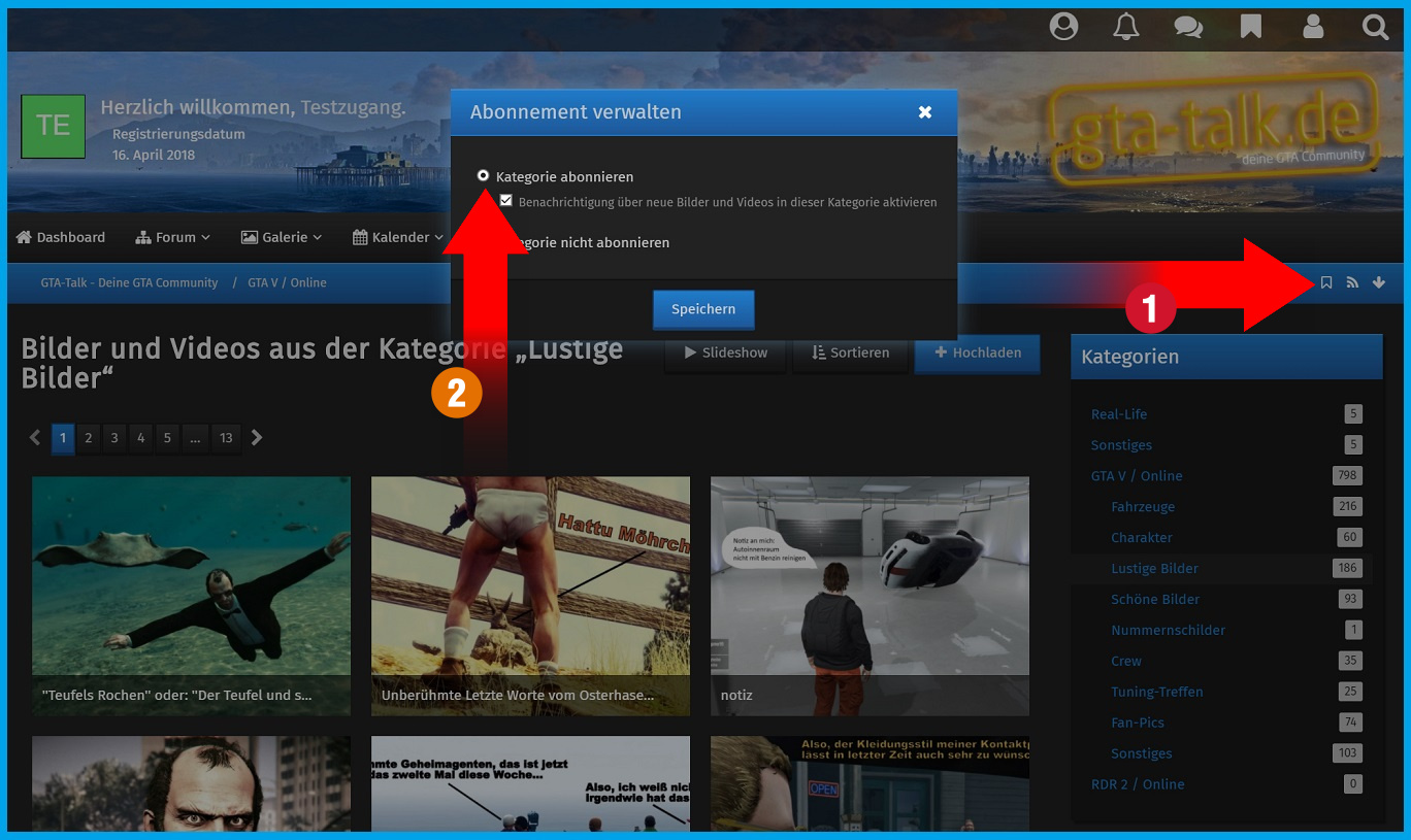 Wenn ihr keine Bilder mehr verpassen möchtet, dann könnt ihr die jeweilige Kategorie in der Galerie auch abonnieren. Sobald ein Bild in die abonnierte Kategorie hochgeladen wird, werdet ihr benachrichtigt. Klickt dazu einfach auf "Abonnement verwalten" (1), abonniert die Kategorie und schaltet die Benachrichtigungen ein (2).