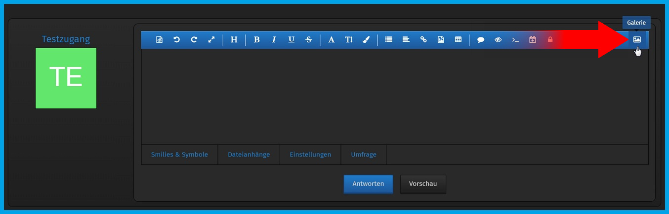 Da das doppelte hochladen von Bildern vermieden werden soll, steht euch eine Funktion zur Verfügung mit der ihr eure Bilder aus der Galerie in einen Beitrag einfügen könnt. Klickt dazu auf das Galerie-Symbol im Editor und wählt euer Bild oder aber auch ein ganzes Album aus.